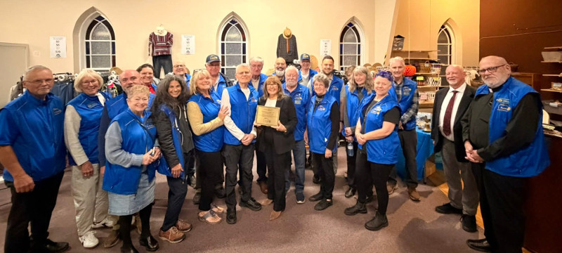 Letters of congratulation from Alex Ruff, MP, and Paul Vickers, MPP, were read to the gathering, and Deputy Mayor Shirley Keaveney brought greetings from the Municipality of Meaford. To close the formalities, the club unveiled a brass plaque which will be affixed to the building’s exterior. Rotarians, Thrift Shop staff, and volunteers and guests raised their glasses to toast the building’s century of service to the community.