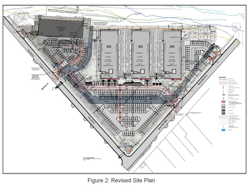 SkyDev’s original proposal for the property included a five-storey hotel and spa, and a four-storey apartment building with underground parking, along with three two-storey townhouse buildings, and four four-storey waterfront townhouse buildings. Their most recent plans include three four-storey rental apartment buildings (five storeys at the water side of the buildings), with aboveground parking, as well as the hotel which will be built by a separate developer.